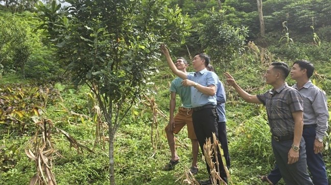 | Lãnh đạo xã Sáng Nhè (tỉnh Điện Biên) kiểm tra tiến độ sinh trưởng cây mắc-ca được hỗ trợ từ chương trình mục tiêu quốc gia vùng đồng bào dân tộc thiểu số và miền núi. |