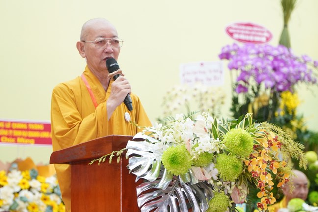 Trưởng lão Hòa thượng Thích Thiện Nhơn - Phó Pháp chủ Hội đồng Chứng minh, Chủ tịch Hội đồng Trị sự Giáo hội Phật giáo Việt Nam phát biểu tại Đại hội