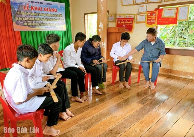 Tham gia lớp học, học viên được nghệ nhân giới thiệu về cấu tạo, nguyên lý phát âm một số nhạc cụ truyền thống của dân tộc Êđê như: chiêng Kram, đing buôt, đing năm, ki pah,…; cách diễn tấu chiêng Kram.