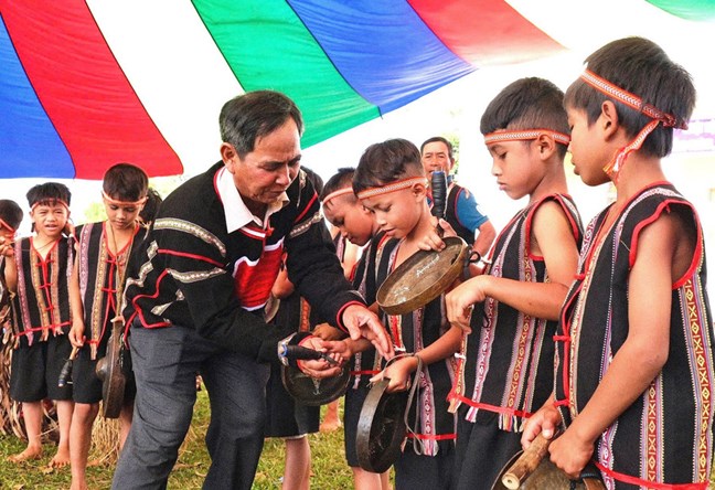 | Nghệ nhân Ưu tú Alip-Đảng viên Chi bộ làng Groi Wết (xã Đak Đoa) truyền dạy cồng chiêng cho thế hệ trẻ của làng, của xã. Ảnh: P.D |