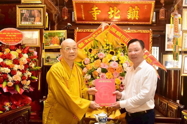 | Giám đốc Sở Dân tộc và Tôn giáo thành phố Nguyễn Sỹ Trường thăm, tặng hoa chúc mừng tại chùa Quán Sứ. Ảnh: Bảo Lâm |