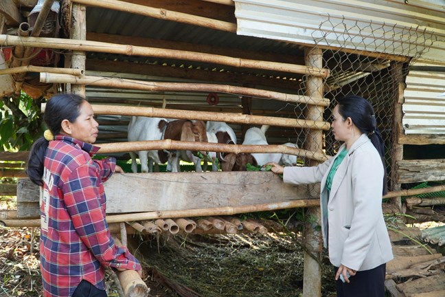 | Chị H’Bình (bên phải) trực tiếp xuống từng hộ gia đình DTTS nắm bắt tình hình chăn nuôi |