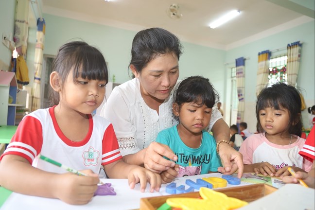 | Giáo viên Trường Mẫu giáo Tâm Thắng chú trọng kèm học sinh trong các giờ học |