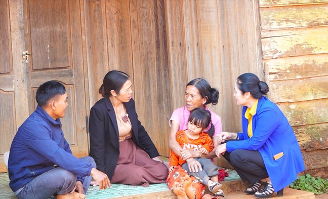 | Cán bộ cấp huyện, xã và bon Bu Sóp, xã Quảng Trực (Lâm Đồng) phối hợp tuyên truyền, vận động các hộ dân trong quản lý, bảo vệ rừng, giữ gìn an ninh biên giới, tích cực lao động sản xuất. (Ảnh Hoàng Trọng) |
