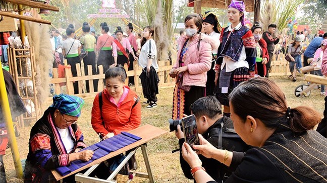 | Khách du lịch hào hứng khám phá không gian văn hóa đồng bào các dân tộc thiểu số tại Điện Biên. (Ảnh: LÊ LAN) |