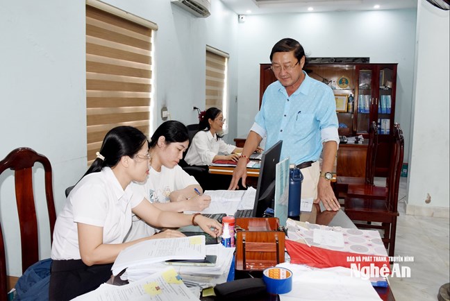 | Ông Đặng Hoàng Phượng trao đổi công việc với các nhân viên. Ảnh: Công Kiên |