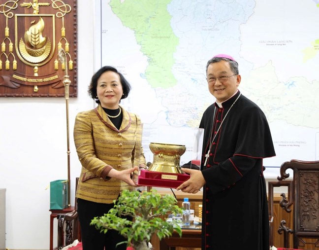 | Phó Thủ tướng Phạm Thị Thanh Trà tặng quà Tòa Giám mục Bắc Ninh - Ảnh: VGP/Thu Giang |