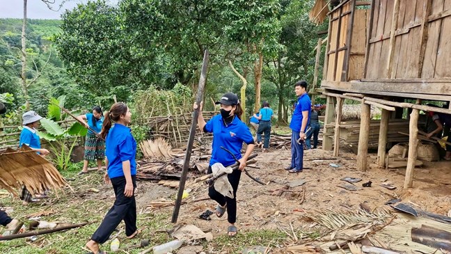 | Đoàn viên, thanh niên hỗ trợ xóa nhà tạm, nhà dột nát cho người dân xã Dân Hóa - Ảnh: Đ.V |