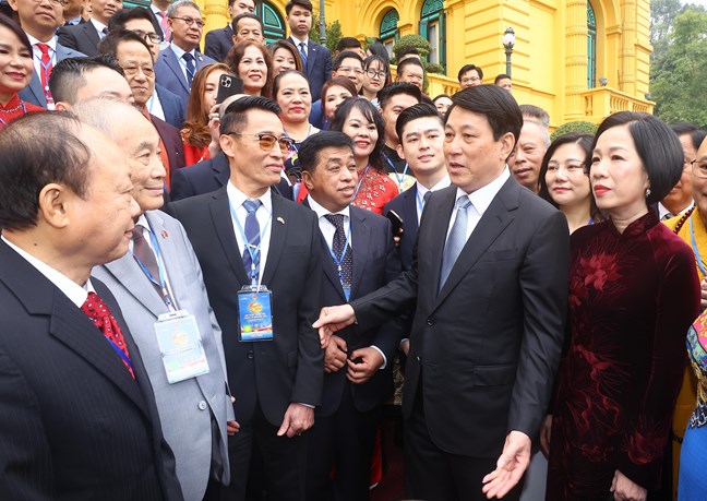 | Ủy viên Bộ Chính trị, Chủ tịch nước Lương Cường và Phu nhân cùng đoàn kiều bào về thăm quê hương nhân dịp tết Nguyên đán Ất Tỵ năm 2025_Ảnh: TTXVN |