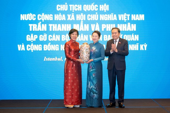 | Chủ tịch Quốc hội Trần Thanh Mẫn trao quà lưu niệm tặng đại diện cộng đồng người Việt Nam tại Thổ Nhĩ Kỳ |