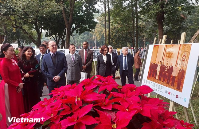 | Đại sứ Đặc mệnh toàn quyền Liên bang Nga tại Việt Nam, ông Bezdetko Gennady Stepanovich (thứ ba từ trái sang) tham quan triển lãm "Chủ tịch Hồ Chí Minh và Liên bang Nga." (Ảnh: Minh Thu/Vietnam+) |