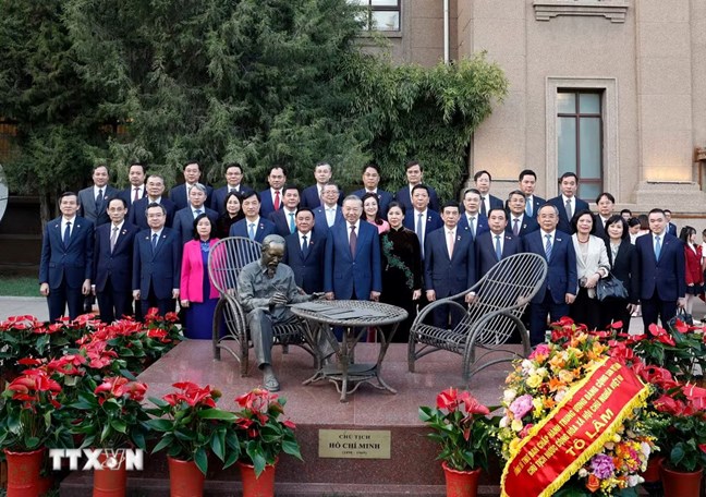 Tổng Bí thư, Chủ tịch nước Tô Lâm và Phu nhân với các đồng chí lãnh đạo Đảng, Nhà nước chụp ảnh lưu niệm tại bức tượng Chủ tịch Hồ Chí Minh trong khuôn viên Đại sứ quán. Ảnh: Thống Nhất/TTXVN