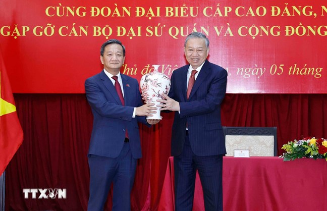Tổng Bí thư Tô Lâm chia sẻ thành công của Đại hội đại biểu toàn quốc lần thứ XIV của Đảng là thành quả của toàn dân tộc, trong đó có sự đóng góp thầm lặng nhưng hết sức to lớn của cộng đồng người Việt Nam ở nước ngoài thông qua trí tuệ, nguồn lực và tình cảm dành cho quê hương, đất nước; đặc biệt, cộng đồng người Việt Nam tại Lào là bộ phận gắn bó, tiêu biểu trong khối đại đoàn kết toàn dân tộc.
