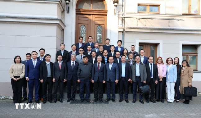 | Phó Thủ tướng Nguyễn Chí Dũng và đoàn công tác chụp ảnh lưu niệm với cán bộ Đại sứ quán và thành viên VGI. (Ảnh: Thu Hằng/TTXVN) |