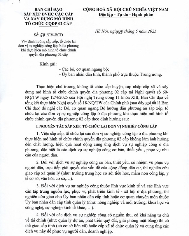Công văn 68/CV-BCĐ nêu rõ: Thực hiện chủ trương không tổ chức cấp huyện, sáp nhập cấp xã và xây dựng mô hình tổ chức chính quyền địa phương 02 cấp tại Nghị quyết số 60-NQ/TW ngày 12/4/2025 của Hội nghị Trung ương 11 khóa XIII, Ban Chỉ đạo về tổng kết thực hiện Nghị quyết số 18-NQ/TW của Chính phủ đề nghị các Bộ, cơ quan ngang Bộ hướng dẫn phương án sắp xếp, tổ chức lại các đơn vị sự nghiệp công lập ở địa phương khi thực hiện mô hình tổ chức chính quyền địa phương 02 cấp theo định hướng sau: