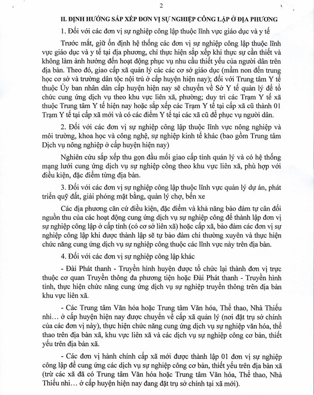 Trước mắt, giữ ổn định hệ thống các đơn vị sự nghiệp công lập thuộc vực giáo dục và y tế tại địa phương, chỉ thực hiện sắp xếp khi thực sự cần thiết và không làm ảnh hưởng đến hoạt động phục vụ nhu cầu thiết yếu của người dân trên địa bàn.