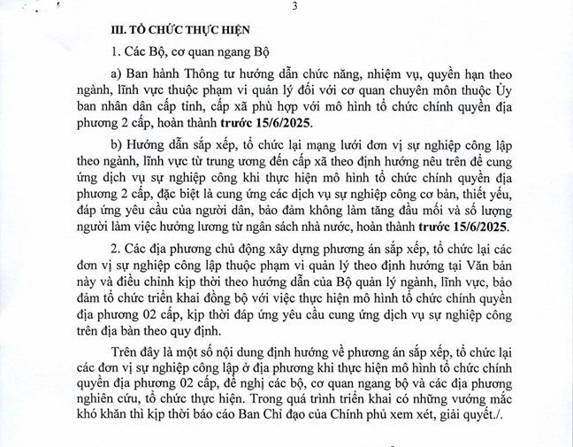 Hướng dẫn sắp xếp, tổ chức lại mạng lưới đơn vị sự nghiệp công lập theo ngành, lĩnh vực từ trung ương đến cấp xã theo định hướng nêu trên để cung ứng dịch vụ sự nghiệp công khi thực hiện mô hình tổ chức chính quyền địa phương 2 cấp, đặc biệt là cung ứng các dịch vụ sự nghiệp công cơ bản, thiết yếu, đáp ứng yêu cầu của người dân, bảo đảm không làm tăng đầu mối và số lượng người làm việc hưởng lương từ ngân sách nhà nước, hoàn thành trước 15/6/2025.