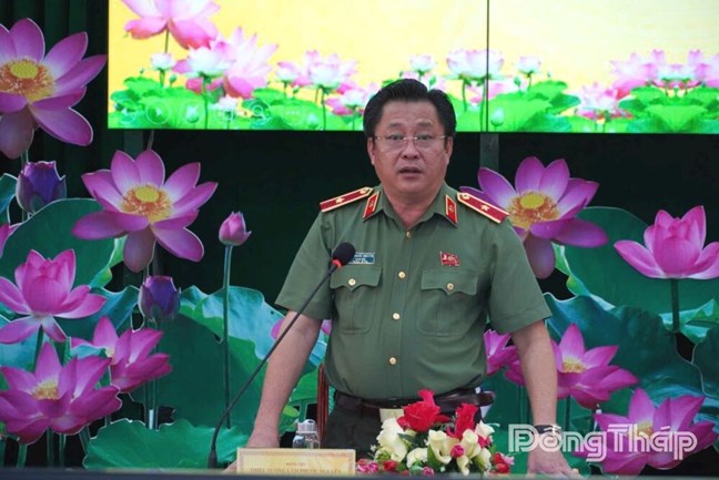 | Thiếu tướng Lâm Phước Nguyên, Ủy viên Ban Thường vụ Tỉnh ủy, Giám đốc Công an tỉnh Đồng Tháp phát biểu tại buổi làm việc |