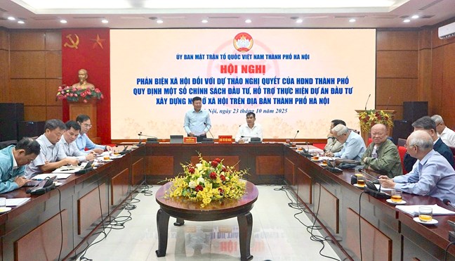(Mặt trận) - Chiều 23/10, Ủy ban Mặt trận Tổ quốc Việt Nam thành phố Hà Nội tổ chức hội nghị phản biện xã hội đối với dự thảo Nghị quyết của HĐND thành phố quy định một số chính sách đầu tư, hỗ trợ thực hiện dự án đầu tư xây dựng nhà ở xã hội trên địa bàn thành phố Hà Nội. Phó Chủ tịch Ủy ban Mặt trận Tổ quốc Việt Nam thành phố Hà Nội Phạm Anh Tuấn chủ trì hội nghị.