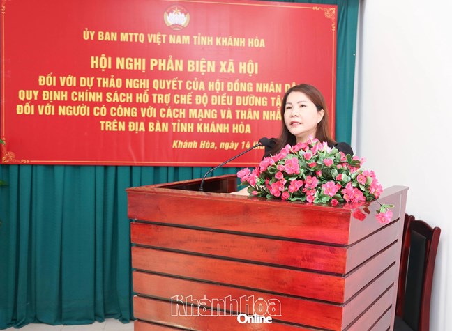 Kết luận Hội nghị, bà Trần Thị Tú Viên - Phó Chủ tịch Ủy ban Mặt trận Tổ quốc Việt Nam tỉnh Khánh Hòa nhấn mạnh: Việc ban hành chính sách hỗ trợ chế độ điều dưỡng tập trung đối với người có công với cách mạng và thân nhân liệt sĩ trên địa bàn tỉnh sẽ góp phần nâng cao chất lượng chăm sóc, phục hồi sức khỏe cho các đối tượng và làm sâu sắc thêm đạo lý “Uống nước nhớ nguồn”, “Đền ơn đáp nghĩa” của dân tộc ta, thể hiện trách nhiệm, tình cảm của Đảng bộ, chính quyền, Nhân dân trong tỉnh đối với những cống hiến, hy sinh của người có công với cách mạng và thân nhân liệt sĩ. Phó Chủ tịch Ủy ban Mặt trận Tổ quốc Việt Nam tỉnh Trần Thị Tú Viên đề nghị cơ quan chủ trì soạn thảo tham mưu chính sách này tiếp thu các ý kiến phản biện tại Hội nghị để hoàn chỉnh hồ sơ dự thảo nghị quyết trình Hội đồng nhân dân tỉnh xem xét, quyết định.