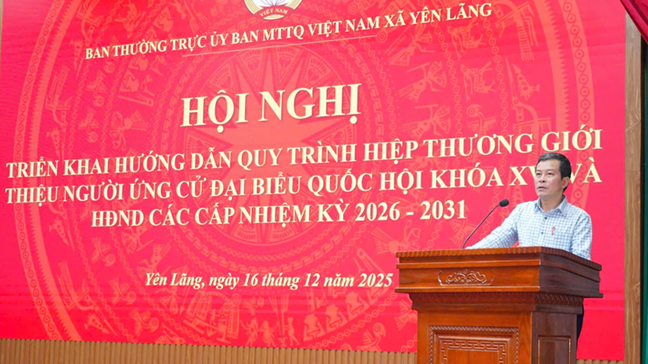 | Ban Thường trực Ủy ban MTTQ Việt Nam xã Yên Lãng, thành phố Hải Phòng tổ chức hội nghị triển khai hướng dẫn quy trình giới thiệu, hiệp thương người ứng cử đại biểu Quốc hội khóa XVI và HĐND các cấp nhiệm kỳ 2026-2031. |