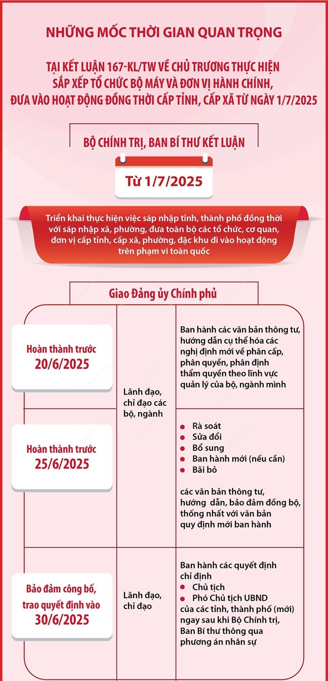 (Mặt trận) - Thay mặt Bộ Chính trị, Ủy viên Bộ Chính trị, Thường trực Ban Bí thư Trần Cẩm Tú vừa ký ban hành Kết luận số 167-KL/TW (ngày 13/6/2025) của Bộ Chính trị, Ban Bí thư về chủ trương thực hiện sắp xếp tổ chức bộ máy và đơn vị hành chính, đưa vào hoạt động đồng thời cấp tỉnh, cấp xã từ ngày 1/7/2025 (gọi tắt là Kết luận số 167).