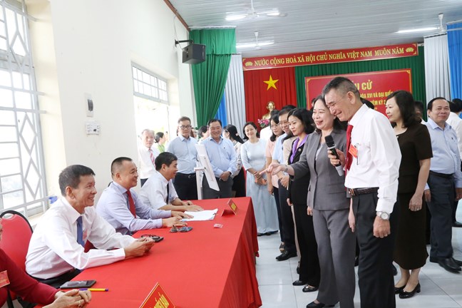 (Mặt trận) - Ngày 6/2, Đoàn giám sát, kiểm tra của Hội đồng Bầu cử quốc gia và Ủy ban Thường vụ Quốc hội do Bí thư Trung ương Đảng, Phó Chủ tịch nước, Phó Chủ tịch Hội đồng Bầu cử quốc gia Võ Thị Ánh Xuân làm Trưởng đoàn đã khảo sát thực tế tại Tổ bầu cử số 32, khu vực bỏ phiếu phường Trấn Biên và làm việc với Ủy ban Bầu cử tỉnh Đồng Nai.