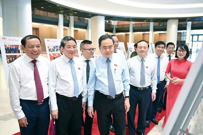 | Chủ tịch Quốc hội Trần Thanh Mẫn cùng các đại biểu tham quan Trưng bày ảnh về hoạt động báo chí tại Quốc hội. Ảnh: Lâm Hiển |