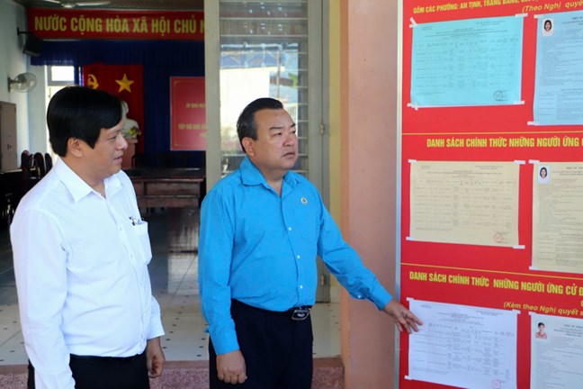 | Phó Bí thư Tỉnh ủy, Trưởng Đoàn ĐBQH tỉnh Phạm Hùng Thái kiểm tra danh sách niêm yết ứng cử viên ĐBQH và HĐND tỉnh tại khu vực bỏ phiếu số 26 (phường Long Hoa) |