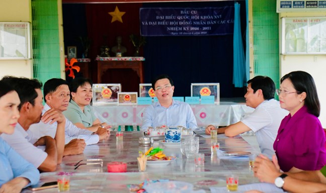 Phó Bí thư Tỉnh ủy, Chủ tịch Ủy ban MTTQ Việt Nam tỉnh Nguyễn Thanh Hải động viên cán bộ ấp tiếp tục chuẩn bị chu đáo cho công tác bầu cử