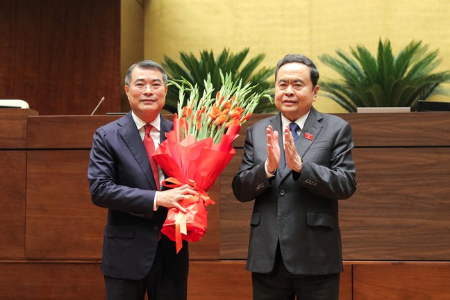 | Chủ tịch Quốc hội Trần Thanh Mẫn thay mặt lãnh đạo Đảng, Nhà nước và đại biểu Quốc hội khóa XVI tặng hoa chúc mừng Thủ tướng Chính phủ Lê Minh Hưng. Ảnh: Hồ Long |