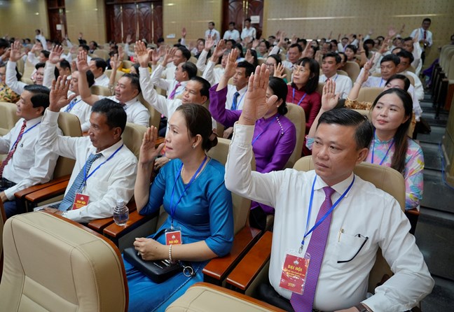 | Đại biểu biểu quyết chương trình Đại hội đại biểu MTTQ Việt Nam tỉnh An Giang lần thứ I, nhiệm kỳ 2025-2030 |