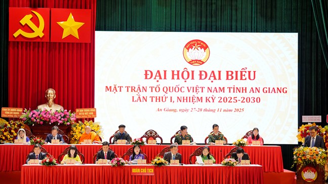 (Mặt trận) - Chiều 27/11, Đại hội đại biểu MTTQ Việt Nam tỉnh An Giang lần thứ I, nhiệm kỳ 2025 - 2030, với phương châm “Đoàn kết - Dân chủ - Đổi mới - Sáng tạo - Phát triển” đã tiến hành ngày làm việc thứ nhất. Đại hội đã hiệp thương cử 129 vị Ủy ban MTTQ Việt Nam tỉnh khóa I, nhiệm kỳ 2025-2030.