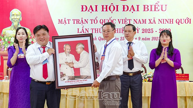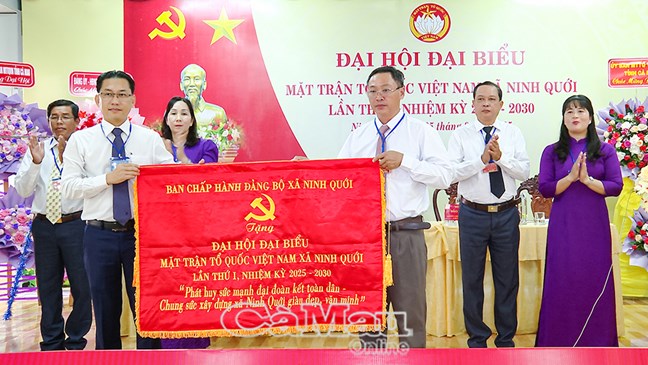 | Đồng chí Nguyễn Minh Nhựt, Bí thư Đảng uỷ xã Ninh Quới, trao tặng Đại hội bức trướng với dòng chữ “Phát huy sức mạnh đại đoàn kết toàn dân- Chung sức xây dựng xã Ninh Quới giàu đẹp văn minh" |
