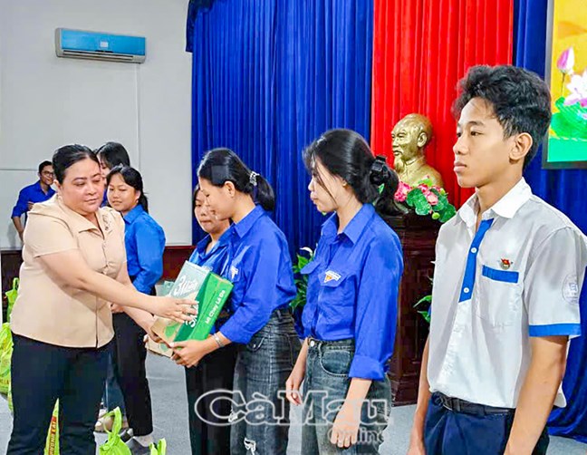 | Bà Trần Thị Thanh Thúy, Chủ tịch Uỷ ban MTTQ Việt Nam xã Hòa Bình trao quà cho đoàn viên, thanh niên có hoàn cảnh khó khăn |