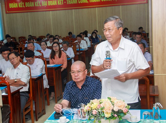 | Ông Lê Thanh Triều, Phó Chủ tịch Thường trực Ủy ban MTTQ Việt Nam tỉnh Cà Mau phát biểu tại hội nghị |