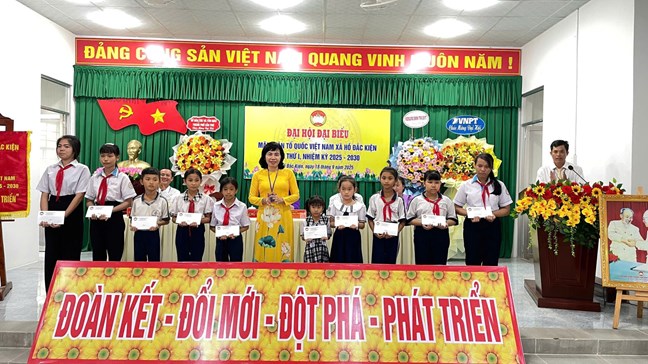 Đồng cí Nguyễn Thị Huệ Chi, Uỷ viên BCH Đảng bộ thành phố, Phó Chủ tịch Uỷ ban MTTQ Việt Nam thành phố trao học bổng cho học sinh tại Đại hội đại biểu MTTQ Việt Nam xã Hồ Đắc Kiện