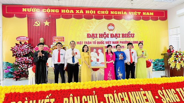 Đồng chí Hồ Thị Cẩm Đào (thứ 3 từ bên phải qua), Phó Bí thư Thành uỷ, Chủ tịch Uỷ ban MTTQ Việt Nam thành phố trao quà lưu niệm cho Đại hội đại biểu MTTQ Việt Nam phường Long Mỹ