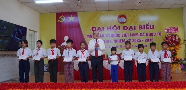 Đồng chí Trần Văn Chính, Uỷ viên Ban thường vụ Thành uỷ, Phó Chủ tịch Thường trực Uỷ ban MTTQ Việt Nam thành phố trao học bổng cho học sinh tại Đại hội đại biểu MTTQ Việt Nam xã Ngọc Tố