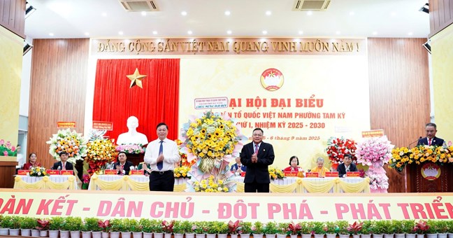 | Chủ tịch Ủy ban MTTQ Việt Nam thành phố Đà Nẵng Lê Trí Thanh tặng hoa chúc mừng Đại hội đại biểu MTTQ Việt Nam phường Tam Kỳ lần thứ I (nhiệm kỳ 2025 - 2030). Ảnh: TÂM ĐAN |