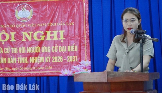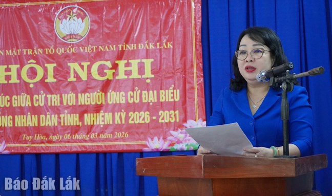 (Mặt trận) - Sáng 06/3, tại Nhà văn hóa khu phố Phú Ân, Ban Thường trực Ủy ban Mặt trận Tổ quốc Việt Nam tỉnh Đắk Lắk tổ chức Hội nghị tiếp xúc cử tri với người ứng cử đại biểu Hội đồng nhân dân tỉnh, nhiệm kỳ 2026 - 2031, thuộc đơn vị bầu cử số 1 phường Tuy Hòa.