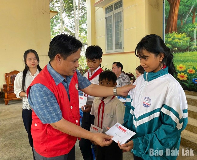 Phó Chủ tịch phụ trách Hội Chữ thập đỏ tỉnh Đắk Lắk Nguyễn Hữu Sửu trao quà cho học sinh vùng thiên tai.