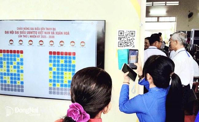 | Các đại biểu quét mã QR để điểm danh và truy cập tài liệu trên ứng dụng đại hội. Ảnh: Đức Quý |