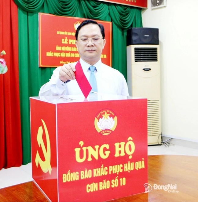 | Phó Chủ tịch Ủy ban MTTQ Việt Nam tỉnh Đồng Nai Nguyễn Tấn Phú ủng hộ đồng bào các tỉnh, thành phố khắc phục hậu quả do cơn bão số 10. Ảnh: Văn Truyên |