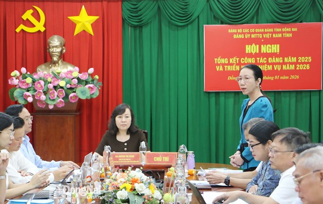 (Mặt trận) - Ngày 8/1, Đảng ủy MTTQ Việt Nam tỉnh Đồng Nai tổ chức Hội nghị Tổng kết công tác xây dựng Đảng năm 2025 và đề ra phương hướng, nhiệm vụ năm 2026. Bà Huỳnh Thị Hằng, Phó Bí thư Tỉnh ủy, Bí thư Đảng ủy MTTQ Việt Nam tỉnh, Chủ tịch Ủy ban MTTQ Việt Nam tỉnh chủ trì hội nghị.