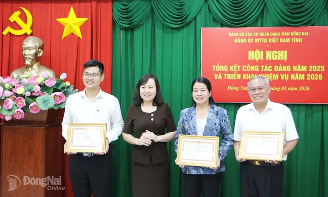 Dịp này, Đảng ủy MTTQ Việt Nam tỉnh tặng giấy khen cho 3 tổ chức Đảng, 65 đảng viên hoàn thành xuất sắc nhiệm vụ năm 2025.