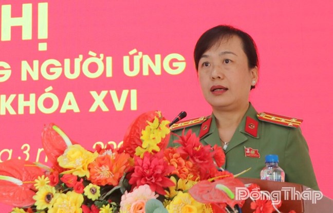 | Bà Võ Thị Hoài Ngọc, Phó Giám đốc Công an tỉnh Đồng Tháp trình bày chương trình hành động |