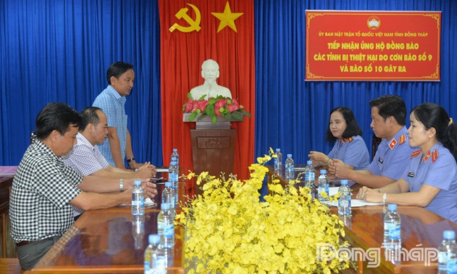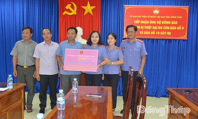 Theo đó, Phó Viện trưởng Viện Kiểm sát Nhân dân tỉnh Đồng Tháp Trần Huỳnh Bích Phượng đã trao bảng tượng trưng hỗ trợ số tiền trên 132 triệu đồng. Đồng thời, đồng chí Trần Huỳnh Bích Phượng chia sẻ: Trước những thiệt hại to lớn cả về người và tài sản do bão số 9 và số 10 gây ra, với truyền thống của dân tộc và tinh thần “tương thân, tương ái”, Viện Kiểm sát Nhân dân tỉnh đã kêu gọi sự đóng góp của toàn thể cán bộ, công chức, viên chức, người lao động trong đơn vị để ủng hộ đồng bào khắc phục hậu quả, sớm ổn định cuộc sống.
