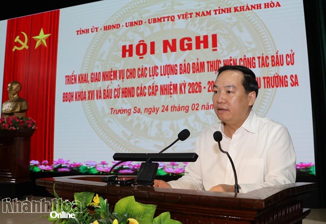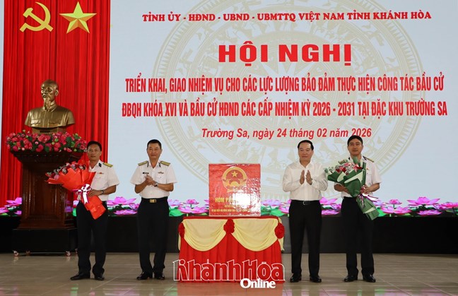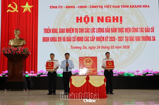 (Mặt trận) - Sáng 24/02, Tỉnh ủy, Hội đồng nhân dân, Ủy ban nhân dân, Ủy ban Mặt trận Tổ quốc Việt Nam tỉnh Khánh Hòa tổ chức Hội nghị triển khai, giao nhiệm vụ cho các lực lượng bảo đảm thực hiện công tác bầu cử đại biểu Quốc hội khóa XVI và đại biểu Hội đồng nhân dân các cấp, nhiệm kỳ 2026 - 2031 tại đặc khu Trường Sa. Dự Hội nghị có các đồng chí: Hồ Xuân Trường, Ủy viên dự khuyết Trung ương Đảng, Phó Bí thư Thường trực Tỉnh ủy Khánh Hòa; Phùng Khánh Tài, Phó Bí thư chuyên trách Đảng ủy Quốc hội; Chuẩn Đô đốc Phạm Minh Tuấn, Phó Tư lệnh Quân chủng Hải quân; Chuẩn Đô đốc Nguyễn Anh Tuấn, Tư lệnh Vùng 4 Hải quân; Chamaléa Thị Thủy, Ủy viên Ban Thường vụ Tỉnh ủy, Giám đốc Sở Dân tộc và Tôn giáo tỉnh Khánh Hòa; Trần Thị Tú Viên, Phó Chủ tịch Ủy ban Mặt trận Tổ quốc Việt Nam tỉnh Khánh Hòa.