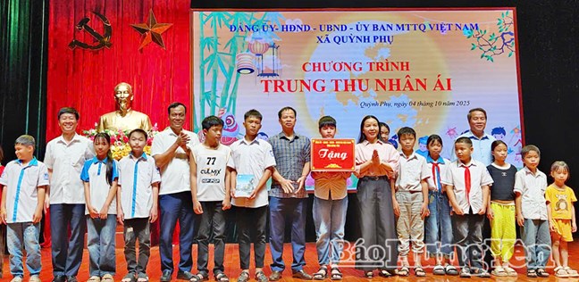 | Phó Chủ tịch Thường trực Ủy ban MTTQ Việt Nam tỉnh và lãnh đạo xã Quỳnh Phụ trao quà cho trẻ em có hoàn cảnh khó khăn |
